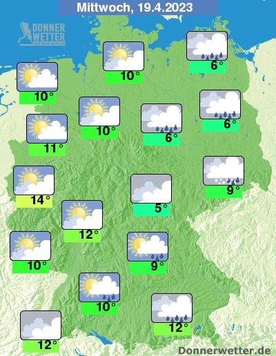 Am Mittwoch zeigen sich besonders im Norden und Westen oft heitere Abschnitte, dabei bleibt es hier meist trocken. Im übrigen Land ziehen jedoch oft viele und teils dichte Wolken durch, dabei bilden sich örtliche Schauer. Die Temperatur steigt auf kühle 5 Grad im Vogtland und bis 14 Grad im Rheinland.