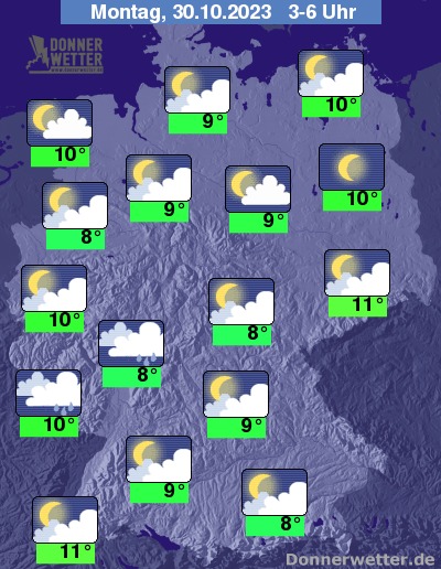 In der Nacht zum Montag zieht es sich im Westen Deutschlands immer weiter zu und es setzt im Verlauf Regen ein. Im großen Rest des Landes zeigt sich der Himmel verbreitet locker bis aufgelockert, teils auch stark bewölkt, dazu bleibt es weitgehend trocken. Die Temperatur sinkt auf 11 Grad in Freiburg und etwa 8 Gard in Erfurt. An den Küsten weht ein oft stürmischer Wind.