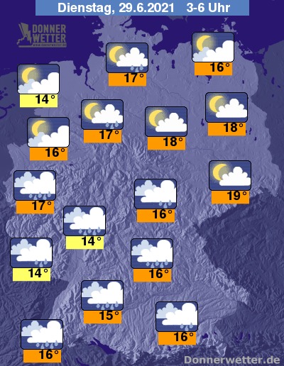 In der kommenden Nacht ist der Himmel über dem Norden oft nur locker, hier und da aber auch stark bewölkt, dabei bilden sich nur selten einzelne Schauer oder Gewitter. Über der Südhälfte bleibt es meist dicht bewölkt und besonders in der ersten Nachthälfte entwickeln sich verbreitet Schauer und teils kräftige Gewitter. Die Temperatur sinkt auf 19 Grad in Dresden und bis 14 Grad in Saarbrücken.