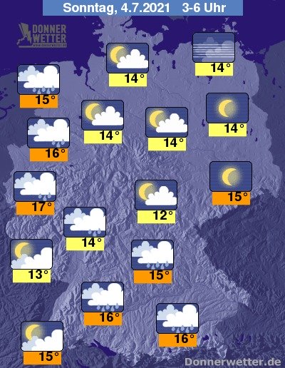 In der folgenden Nacht ziehen über die Südwesthälfte meist dichte Wolken hinweg und es bilden sich gebietsweise, teils kräftige Schauer. Weiter nach Norden und Osten hin ist es hingegen nur locker bewölkt oder sogar sternenklar, hier bleibt es trocken. Die Temperatur sinkt auf 17 Grad in der Kölner Bucht und etwa 12 Grad in Erfurt.