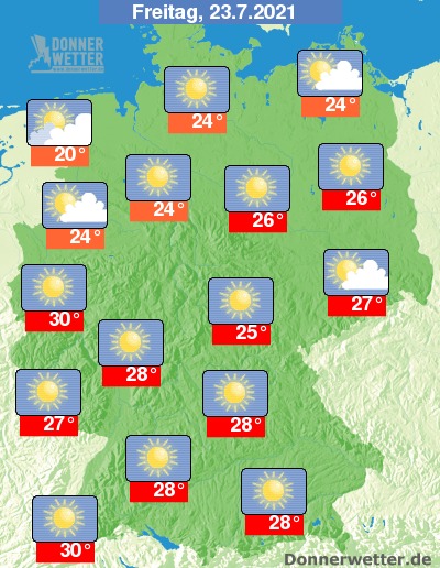 Am Freitag ist es verbreitet heiter bis sonnig. Im Südwesten und im Nordseeumfeld können im Tagesverlauf oft einige Wolken aufziehen, dabei bleibt es aber trocken. Die Temperatur erreicht 20 Grad an der Nordseeküste und bis 30 Grad entlang des Rheins.