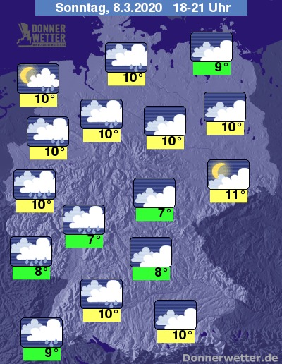 Heute Abend bleibt es über dem Land überwiegend bedeckt, nur im Osten ist es noch hier und da etwas aufgelockert bewölkt, dabei fällt über der Westhälfte zeitweise Regen, während es weiter nach Osten hin noch trocken bleibt. Die Temperatur liegt bei 7 Grad am Westerwald und bis 11 Grad in Dresden.