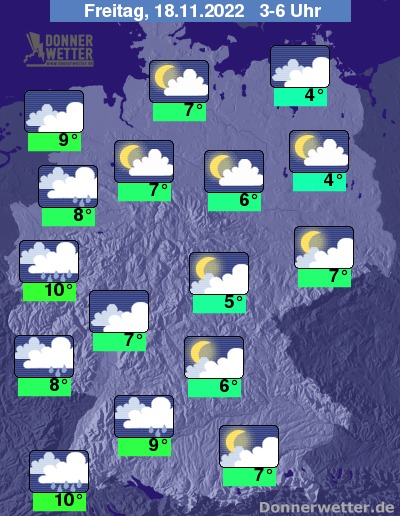 In der Nacht zum Freitag zeigt sich der Himmel über der Osthälfte Deutschlands oft wechselnd bis aufgelockert, teils auch stark bewölkt, hier bleibt es trocken. Von Westen her zieht jedoch erneut ein Tiefausläufer heran, der bis zum Morgen etwa die Westhälfte der Republik erreicht, dabei fällt verbreitet, teils langanhaltender Regen. Die Temperatur sinkt auf 10 Grad am Rhein und 4 Grad an der Oder. An der Ostsee weht noch ein oft stürmischer Wind.