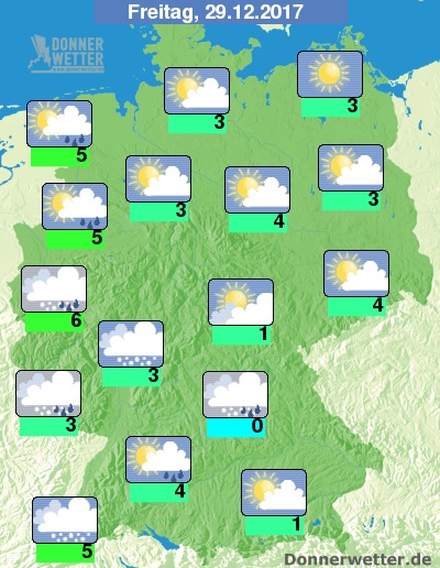Nach kalter Nacht mit häufigem Frost wechseln sich kurze sonnige Abschnitte mit Wolken ab. Gegen Mittag trübt sich der Himmel im Westen ein und später setzt Schneefall oder Schneeregen mit Gefahr von Glätte ein. Dieser geht dann bis zum Abend unter Zufuhr milderer Luft aber allgemein in Regen über. Außerdem frischt der Südwestwind zeitweise auf. Die Höchsttemperaturen liegen in Bayern häufig im leichten Dauerfrostbereich, sonst steigen die Werte auf 1 bis 6 Grad. Abends und nachts zieht der Niederschlag auch in die östlichen Gebiete. Nach kurzer trockener Phase zieht in der zweiten Nachthälfte neuer Regen in den Westen.