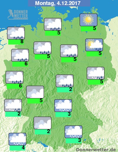Im Südosten und über dem Erzgebirge schneit es zeitweise, in tieferen Lagen fällt auch Schneeregen. Es muss mit Glätte gerechnet werden. Sonst ist es oft teils neblig-trübe mit etwas Regen oder Sprühregen. Im Nordosten gibt es möglicherweise auch Auflockerungen mit sonnigen Phasen. Hier bleibt es wohl auch trocken. Im Süden und Osten werden meist nur 0 bis 4 Grad erreicht, im Nordwesten steigen die Werte auf mildere 4 bis 9 Grad. Der West- bis Nordwestwind kann gebietsweise auffrischen.