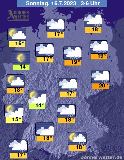 In der Nacht zum Sonntag bleibt es über der Osthälfte meist bedeckt und hier bilden sich verbreitet Schauer und vor allem über Bayern noch örtliche Gewitter. Weiter nach Westen hin klingen die Niederschläge bereits vor Mitternacht weitgehend ab und der Himmel klart meist auf. Die Temperatur sinkt auf 20 Grad in Dresden und bis 14 Grad in Münster.
