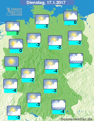 Die Temperaturen erreichen am Tag Höchstwerte um -5 Grad C im Thüringer Wald und um 2 Grad C in Ostfriesland.