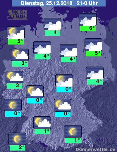 Während der zweiten Nachthälfte leuchten im Süden und Südwesten häufig Mond und Sterne, später können sich regionale Nebelfelder bilden. Im Nordosten bleibt es meistens bewölkt.