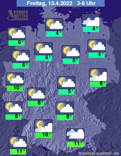 In der Nacht zum Freitag ist der Himmel häufig locker, teils aber auch stark bewölkt. Im Südosten können sich noch einzelne Schauer bilden, sonst bleibt es trocken. Die Temperatur sinkt auf 11 Grad in München und bis 4 Grad in Hamburg.