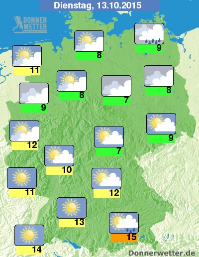 Am Dienstag ist es im Süden Deutschlands verbreitet heiter bis sonnig und trocken, am Alpenrand kommen jedoch dichte Wolken mit zeitweiligem Regen auf. Vom Norden bis in die breite Mitte des Landes ist es überwiegend stark, gebietsweise aber auch aufgelockert bewölkt, dabei fällt im äußeren Norden und Nordosten auch zeitweise Regen, sonst bleibt es aber trocken. Die Temperatur steigt auf 7 Grad in Erfurt und bis etwa 15 Grad in München.