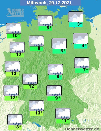 Heute bleibt es weitgehend bedeckt, vor allem über der Osthälfte ist es oft auch neblig-trüb, jedoch weitgehend trocken. Über der Westhälfte fällt zeitweise Regen, während es weiter nach Osten hin meist trocken bleibt. Die Temperatur steigt auf 3 Grad an der Müritz und bis 13 Grad entlang des Rheins.