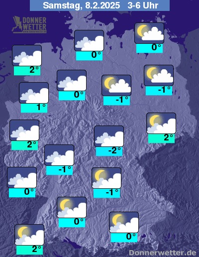In der Nacht zum Samstag zeigt sich der Himmel über der Süd- und Osthälfte vielerorts nur gering bewölkt, gebietsweise kann sich Nebel bilden. In den übrigen Landesteilen bleibt es stark bewölkt oder bedeckt. Es bleibt trocken.