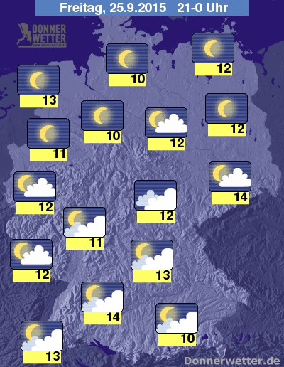 Heute Abend zeigt sich der Himmel über dem Norden der Republik verbreitet sternenklar. Weiter nach Süden hin zieht jedoch teils lockere, teils aber auch stärkere Bewölkung durch, dabei bleibt es allerdings trocken. Die Abendtemperaturen bewegen sich zwischen 14 Grad in Leipzig und etwa 10 Grad am nördlichen Schwarzwaldrand.