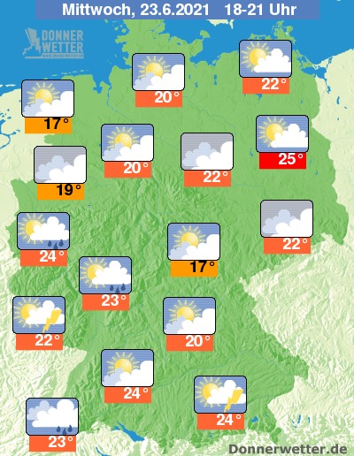 Heute Abend bleibt es oft stark bewölkt, Auflockerungen sind aber ebenfalls möglich. Im Süden bilden sich vielerorts Schauer und auch lokale Gewitter. Im Westen sind ebenso vereinzelt Schauer möglich. Im übrigen Bundesgebiet bleibt es bei wechselnder bis starker Bewölkung trocken. Die Temperatur liegt bei 17 Grad in Emden und bis 25 Grad in Berlin.
