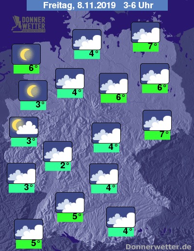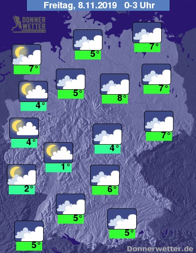 In der Nacht ist der Himmel über weiten Landesteilen bedeckt; Wolkenlücken gibt es meist nur in der Westhälfte, im äußersten Nordwesten kann es im Nachtverlauf auch aufklaren. Es bleibt meist trocken.