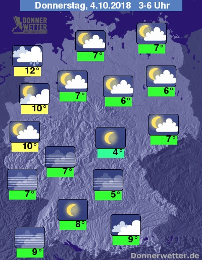 In der Nacht zeigt sich der Himmel über dem Bundesgebiet meist locker oder aufgelockert bewölkt, in Küstennähe können dichtere Wolken auch mal einzelne Schauer bringen. Im Südwesten kann sich im Nachtverlauf regional Nebel bilden.