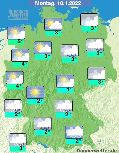 Am Montag fällt im Süden zunächst noch gebietsweise Schnee, Schneeregen oder Regen, sonst ist es oft stark bewölkt oder trüb. Auflockerungen zeigen sich aber vor allem auch im Westen und Nordwesten des Landes, hier bleibt es trocken. Im Osten kann stellenweise etwas Regen oder Schnee fallen. Die Temperatur steigt auf 1 Grad im Grabfeld und bis 5 Grad an der Nordsee.