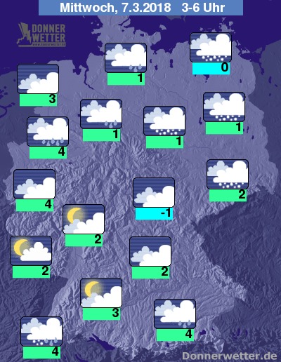 In der kommenden Nacht verlagern sich die dichten Wolken mit Schnee, Schneeregen und Regen auf die Nordosthälfte Deutschlands, dabei muss verbreitet mit Straßenglätte gerechnet werden! Dichte Wolken mit Regen oder Schnee sind zudem im Alpenvorland möglich, auch hier können die Straßen teils erheblich glatt sein! In den übrigen Landesteilen ist es teils stark, teils aufgelockert bewölkt und größtenteils trocken. Die Temperatur sinkt auf 4 Grad entlang des Rheins und bis etwa -1 Grad im Eichsfeld.
