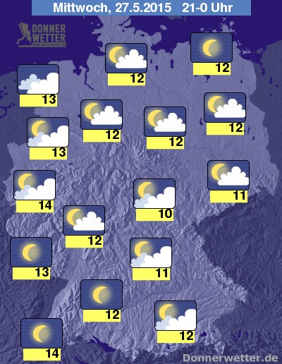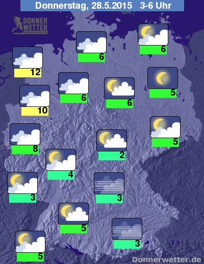 In der Nacht zum Donnerstag ist es über der Südosthälfte Deutschlands verbreitet locker bewölkt oder sternenklar und dabei trocken. Von Nordwesten her ziehen dagegen zunehmend dichte Wolken auf, dazu bleibt es aber weitgehend trocken. Die Temperatur sinkt auf 12 Grad direkt an der Nordsee und bis 2 Grad am Frankenwald.