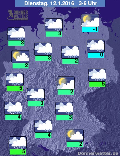 Heute Abend ist es im Nordosten noch meist locker oder aufgelockert bewölkt und dazu weitgehend trocken, sonst ziehen auch im Norden, wie bereits im übrigen Bundesgebiet dichte Wolken auf, die im weiteren Verlauf für Regen, teils auch für Schneeregen sorgen, stellenweise besteht Glättegefahr! Im Süden und Westen fällt nur noch gebietsweise etwas Regen, zumeist bleibt es hier trocken, jedoch auch meist stark bewölkt. Die Abendtemperatur liegt bei 6 Grad in Aachen und um 0 Grad in Vorpommern. Über der Südhälfte weht ein teils starker Wind.