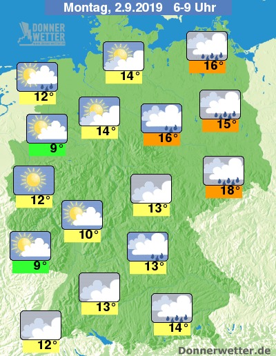 Die Temperaturen liegen in den Frühstunden bei herbstlichen 9 Grad im Münsterland und 18 Grad im Vogtland.