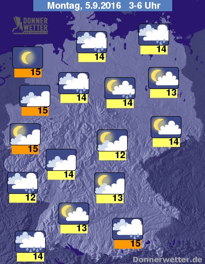 In der Nacht zum Montag bleibt es im Süden Deutschlands überwiegend bedeckt und besonders am Alpenrand fällt zeitweise, teils langanhaltender Regen. Meist dicht bewölkt mit wiederholten Schauern, örtlich auch Gewittern ist es im Bereich des Ostseeumfeldes, sonst ist es im Norden teils klar, gebietsweise aber auch stark bewölkt, dazu sind aber nur vereinzelt Schauer möglich. Im großen Rest des Landes ist es oft nur leicht, hier und da aber auch stark bewölkt, jedoch größtenteils trocken. Die Temperatur sinkt auf 15 Grad in Köln und bis 12 Grad im Thüringer Becken.