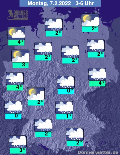 Am Montag ist es vor allem im Norden oft heiter, vor allem im Süden und Osten halten sich jedoch oft auch dichte Wolken, hier bilden sich einzelne Schnee- oder Regenschauer, während es sonst größtenteils trocken bleibt. Die Temperatur steigt auf 4 Grad in Nürnberg und bis 7 Grad in Bonn. Es weht ein oft noch starker bis stürmischer Wind. An der See herrscht häufig auch Sturm.