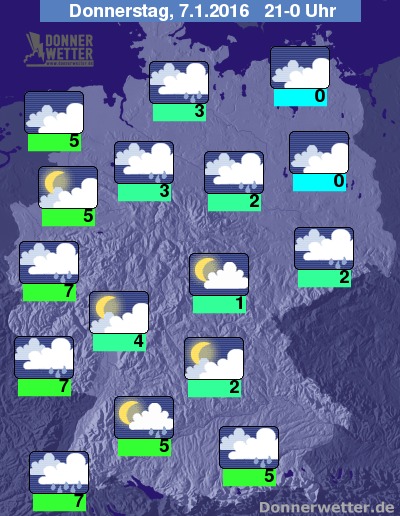 Heute Abend breitet sich der Regen auch auf den Norden und Osten des Landes aus, dabei fällt der Niederschlag auch zum Teil als Schnee oder Schneeregen, sogar gefrierender Regen ist möglich, dabei besteht erhebliche Glättegefahr! Im übrigen Bundesgebiet regnet es zunächst ebenfalls, gegen Miternacht lässt der Regen im Südwesten des Landes oft nach, es bleibt oft stark, teils ist es aber auch aufgelockert bewölkt. Die Abendtemperatur liegt bei 7 Grad in Düsseldorf und um 0 Grad in Schwerin. An den Küsten weht ein teils starker Wind.