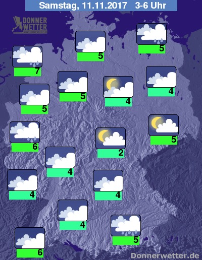In der folgenden Nacht fällt im Süden unter dichten Wolken noch gebietsweise Regen, sonst ist es oft stark, teils aber auch mal nur locker bis aufgelockert bewölkt und dazu trocken. Im Norden bleibt es eher stark bewölkt, dabei sind einzelne Schauer möglich. Die Temperatur sinkt auf 7 bis 2 Grad. An den Küsten weht ein oft starker und teils stürmischer Wind.