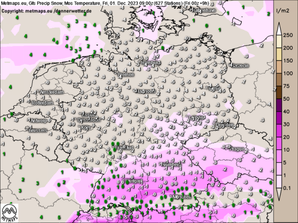 Am Freitag bleibt der Himmel über den mittleren und südlichen Landesteilen stark bewölkt und immer wieder ist mit Schauern zu rechnen. Überwiegend fallen diese als Schnee, vom Hochrhein bis zum Alpenrand fällt auch Schneeregen oder Regen. Lokal ist hier mit glatten Straßen zu rechnen. In der Nordhälfte ist es zumeist wechselnd bis aufgelockert bewölkt und es bleibt meist trocken.