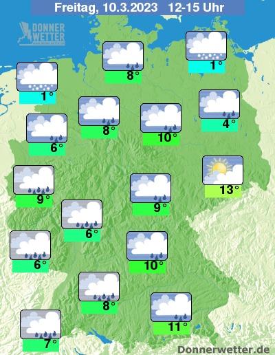 Heute Nachmittag ziehen verbreitet dichte Wolken über das Bundesgebiet hinweg, dabei fällt häufig Regen, im Norden zum Teil auch Schnee. Die Temperatur liegt bei 1 Grad auf Rügen und 13 Grad in der Lausitz.