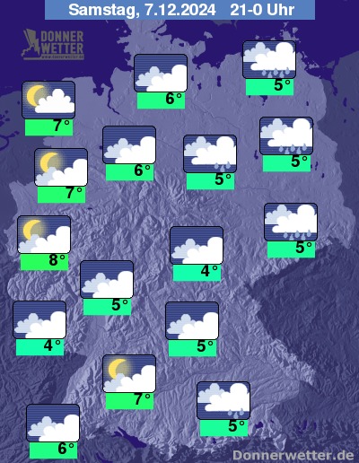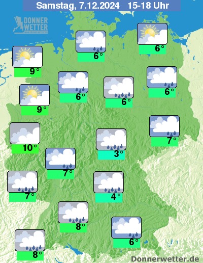 Am Samstagnachmittag zeigt sich der Himmel verbreitet stark bewölkt oder es ist bedeckt; dabei fällt von West nach Ost ziehender, teils anhaltender und kräftiger Regen; in den Hochlagen auch Schnee. Im Westen und Nordwesten bleibt es bei längeren Auflockerungen überwiegend niederschlagsfrei.