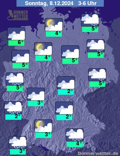 In der Nacht zum Sonntag ziehen im Westen neue Niederschläge auf, die oberhalb von 500 bis 700 m auch als Schnee fallen können. Auch am Alpenrand fällt zeitweise Schnee. In den übrigen Landesteilen lockert die Wolkendecke nach Abzug der Niederschlagsgebiete nach Osten auch mal auf und es bleibt meist trocken.