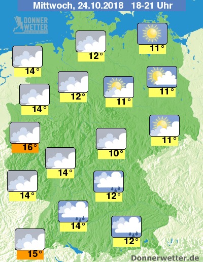 Am frühen Abend dominieren meistens die Wolken, lediglich im Nordosten kann man noch einige erhellende Strahlen der untergehenden Abendsonne genießen. Vor allem im Süden und Staulagen der Mittelgebirge fällt etwas Regen oder Sprühregen. Die Temperaturen liegen meist so zwischen 10 und 14 Grad, im Westen, sowie im Markgräflerland bleibt es etwas milder.