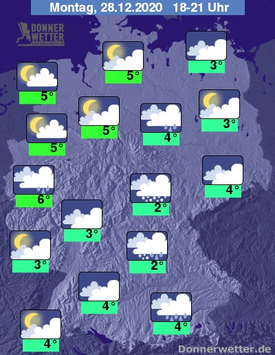 In den Abendstunden verdichten sich die Wolken über der Nordhälfte Deutschlands zunehmend; Auflockerungen beschränken sich dann vor allem auf das Küstenumfeld. In der Südhälfte bleibt der Himmel weitgehende bedeckt, entlang der Donau kann es zeitweise auch mal auflockern. Mit Niederschlägen, die in höheren Lagen auch als Schnee fallen können, muss am Montagabend vor allem im Südwesten, Südosten sowie in Brandenburg gerechnet werden.
