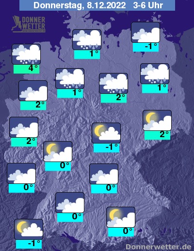 In der Nacht auf Donnerstag zeigt sich der Himmel über der Nordhälfte wechselnd oder stark bewölkt und vor allem in den Frühstunden muss immer wieder mit Regen-, Schneeregen- oder Schneeschauern gerechnet werden. Im Süden des Landes ist es teils stark, teils aufgelockert bewölkt und es bleibt meist trocken.