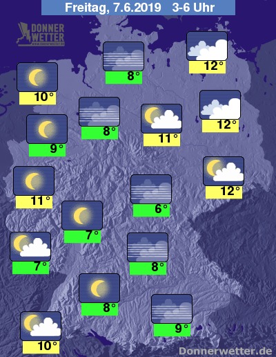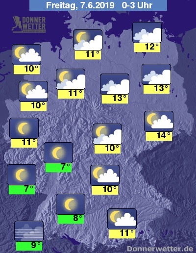 In der Nacht zeigt sich der Himmel in der Nord- und Osthälfte zunächst noch häufig bedeckt oder aufgelockert bewölkt, im weiteren Verlauf lockern die Wolken dann gebietsweise auf. Eine geschlossene Wolkendecke hält sich dann meist nur noch im äußersten Nordosten. Im Süden und Osten ist es zunächst häufig sternenklar, später kann sich verbreitet Nebel ausbilden. Schauer sind in der Nacht nicht zu erwarten.