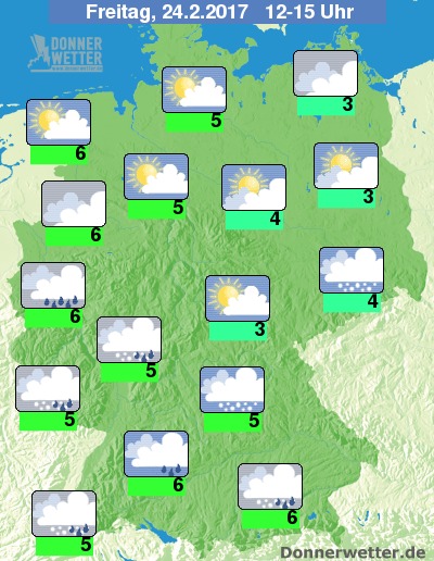 Am Nachmittag lassen die Niederschläge in der Nordhälfte langsam nach und konzentrieren sich dann zunehmend auf den Süden des Landes. In Nordseenähe kommt gelegentlich sogar die Sonne zum Vorschein.