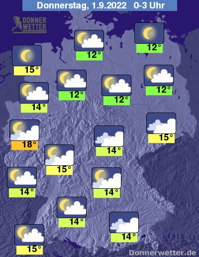 In der Nacht auf Donnerstag überwiegt über weiten Landesteilen lockere oder aufgelockerte Bewölkung; im Norden und Nordwesten klart es in den frühen Morgenstunden auch auf. Dichtere Wolken halten sich über der Südosthälfte. Es bleibt aber weitgehend trocken