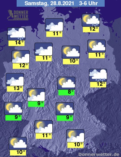 In der Nacht zum Samstag bilden sich nur noch örtlich einzelne Schauer, vielerorts lockert es auf. Besonders im Norden und im Osten bleibt es aber überwiegend stark bewölkt. Die Temperatur sinkt auf 14 Grad in Emden und bis 8 Grad in Erfurt.