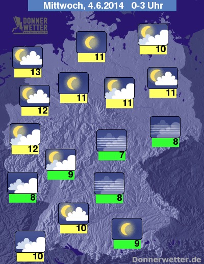 In der Nacht klingen letzte Schauer im Westen des Landes meist rasch ab, im Folgenden bleibt es bei meist aufgelockerter Bewölkung, zum Teil auch bei klarem Himmel, trocken. Die Temperaturen sinken bis zum Morgen auf 12 bis 6 Grad.