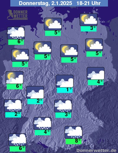 In der Nacht zum Freitag fällt im Alpenvorland unter dichten Wolken noch zeitweise Regen, Schneeregen oder Schnee. Im übrigen Süden ist es stark bewölkt, aber meist trocken. Von der Breiten Landesmitte bis nach Norden ist der Himmel häufig aufgelockert, gebietsweise aber auch stark bewölkt, dazu ist nur selten etwas Schneefall möglich. Die Temperatur sinkt auf 2 Grad an der Nordsee und bis -3 Grad am Taunus.