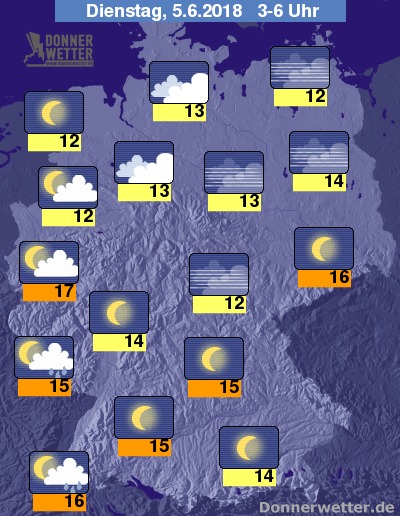 In der kommenden Nacht sind im Südwesten noch lokale Schauer und Gewitter möglich, sonst zeigt sich der Himmel dagegen meist nur locker bis aufgelockert bewölkt oder sternenklar, dazu bleibt es trocken. Die Temperatur sinkt auf 17 Grad in der Kölner Bucht und bis 12 Grad an der Müritz.
