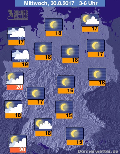 In der Nacht zum Mittwoch zeigt sich der Himmel über dem Land größtenteils sternenklar, dazu bleibt es trocken. In die westlichsten Landesteile ziehen allerdings oft dichte und teils noch aufgelockerte Wolken auf, die hier vor allem Vom Emsland bis hin zum Münsterland auch Schauer bringen, sonst ist es meist trocken. Die Temperatur sinkt auf tropische 20 Grad in Köln und bis 15 Grad in Mittelfranken.