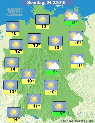 Am Sonntag ist es wiederum verbreitet heiter oder sonnig, dabei bleibt es trocken. Die Temperatur erreicht meist vorfrühlingshafte Werte zwischen 9 bis 14 Grad.