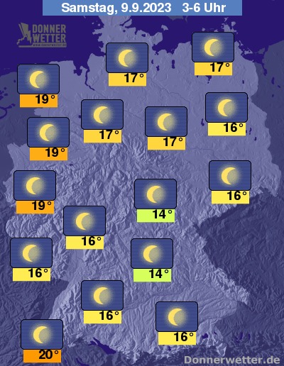 In der kommenden Nacht funkeln die Sterne von einem wolkenlosen Himmel, dazu bleibt es trocken. Die Temperatur sinkt auf tropische 20 Grad am Oberrhein und bis 14 Grad im Vogtland.