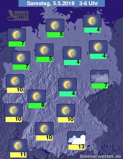 In der kommenden Nacht klart der Himmel auch über dem Süden meist auf, ganz am Alpenrand können sich noch dichtere Wolken halten, die hier aber kaum Niederschläge bringen, sonst ist es verbreitet sternenklar und trocken. Die Temperatur sinkt auf 13 Grad in München und bis 4 Grad an der Müritz.
