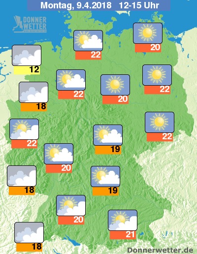 Heute Nachmittag sind die Wolken westlich von Rhein und Ems schon meist dicht und auch in den übrigen westlichen Landesteilen ziehen meist viele, jedoch noch verbreitet aufgelockerte Wolken durch, dabei bleibt es trocken. Im Norden und Osten ist es verbreitet sonnig, im Süden teils locker, teils aufgelockert bewölkt. Es bleibt überall trocken. Die Temperatur liegt bei 12 Grad an der Nordsee und bis 22 Grad in der Lausitz.