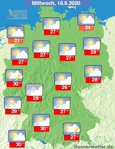 Die Höchsttemperaturen liegen nochmals zwischen 27 und 32 Grad, an den Küsten von Nord- und Ostsee bleibt es aber mit auflandigem Wind schon wesentlich kühler.
