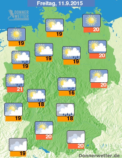 Am Freitag überwiegt ein Mix aus Sonne, Wolken und einzelnen Schauern. In der Südhälfte wird sich die Sonne am wenigsten zeigen, im hohen Norden wird der Start ins Wochenende wohl am freundlichsten verlaufen. Die Temperaturen steigen auf Höchstwerte um 16 bis 21 Grad C.